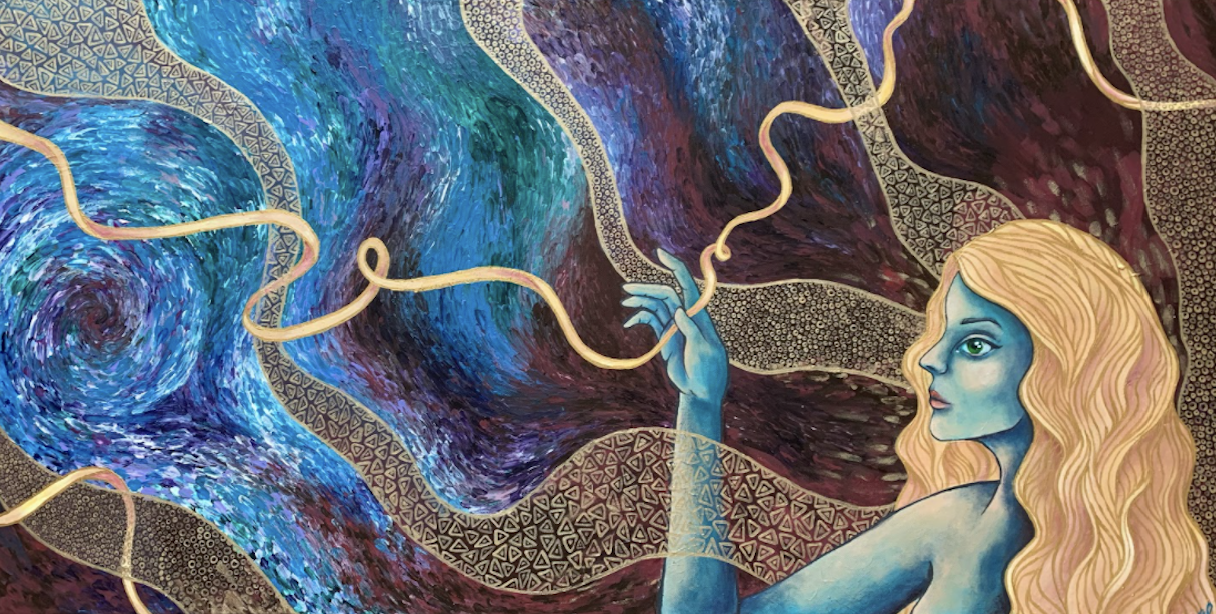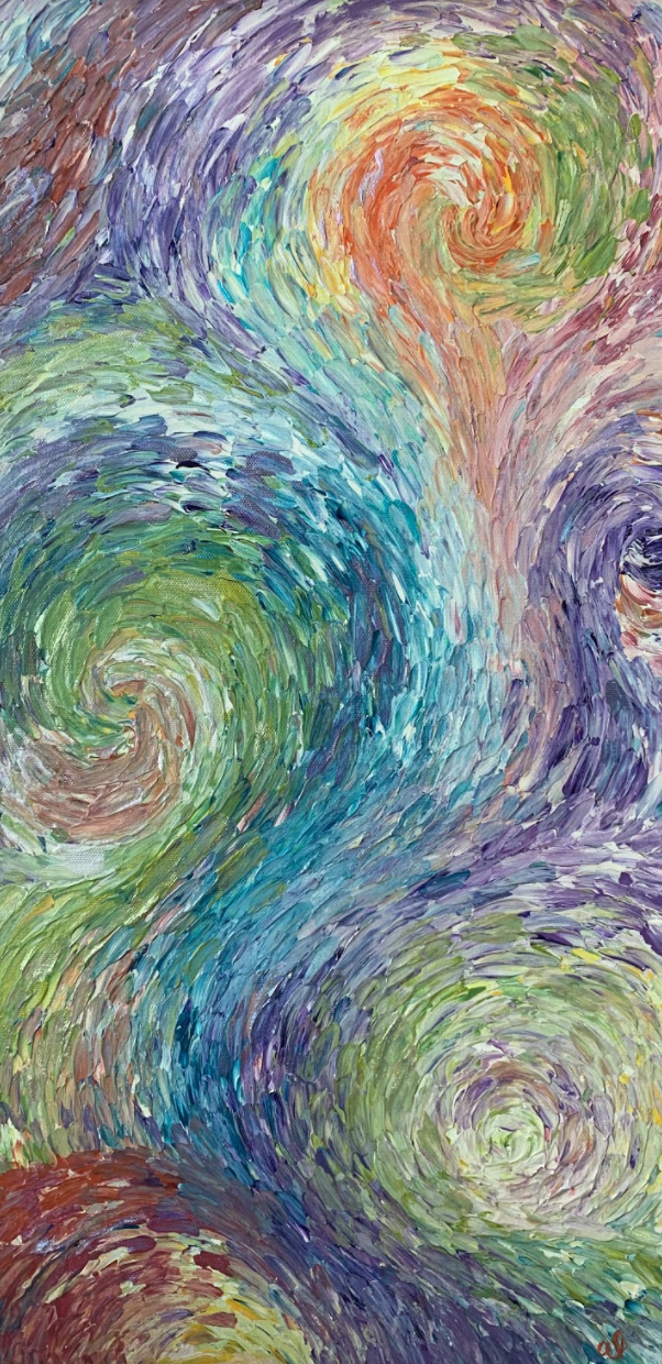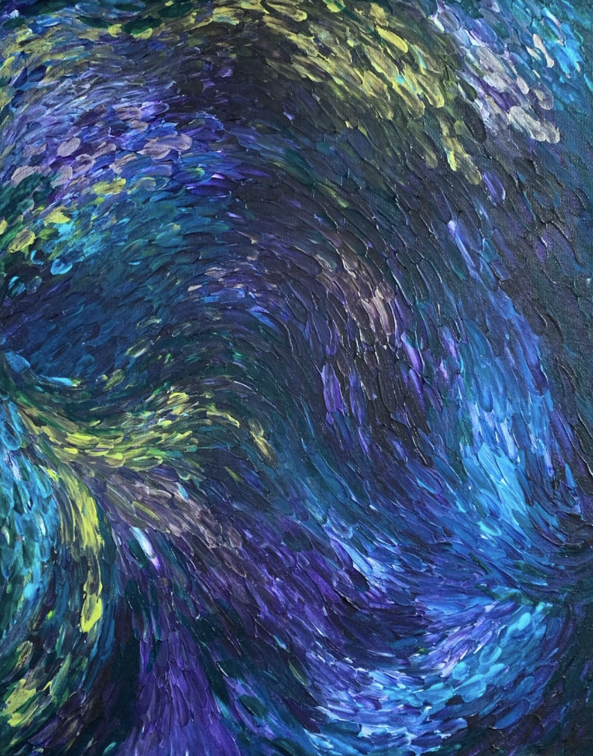 This circular painting is an interpretation of the colors and movement of the star in space.